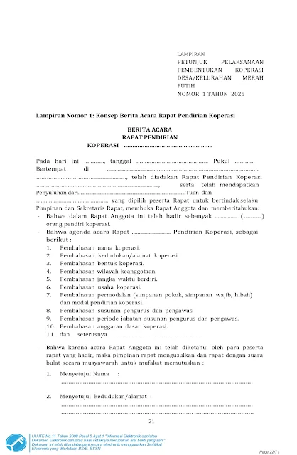 Konsep Berita Acara Rapat Pendirian Koperasi Desa Merah Putih ini adalah format yang diberikan dalam petunjuk teknis pelaksanaan pembentukan koperasi desa merah putih sesuai surat edaran Menteri Koperasi Republik Indonesia Nomor 1 Tahun 2025 tentang Pembentukan Koperasi Desa/Kelurahan Merah Putih.